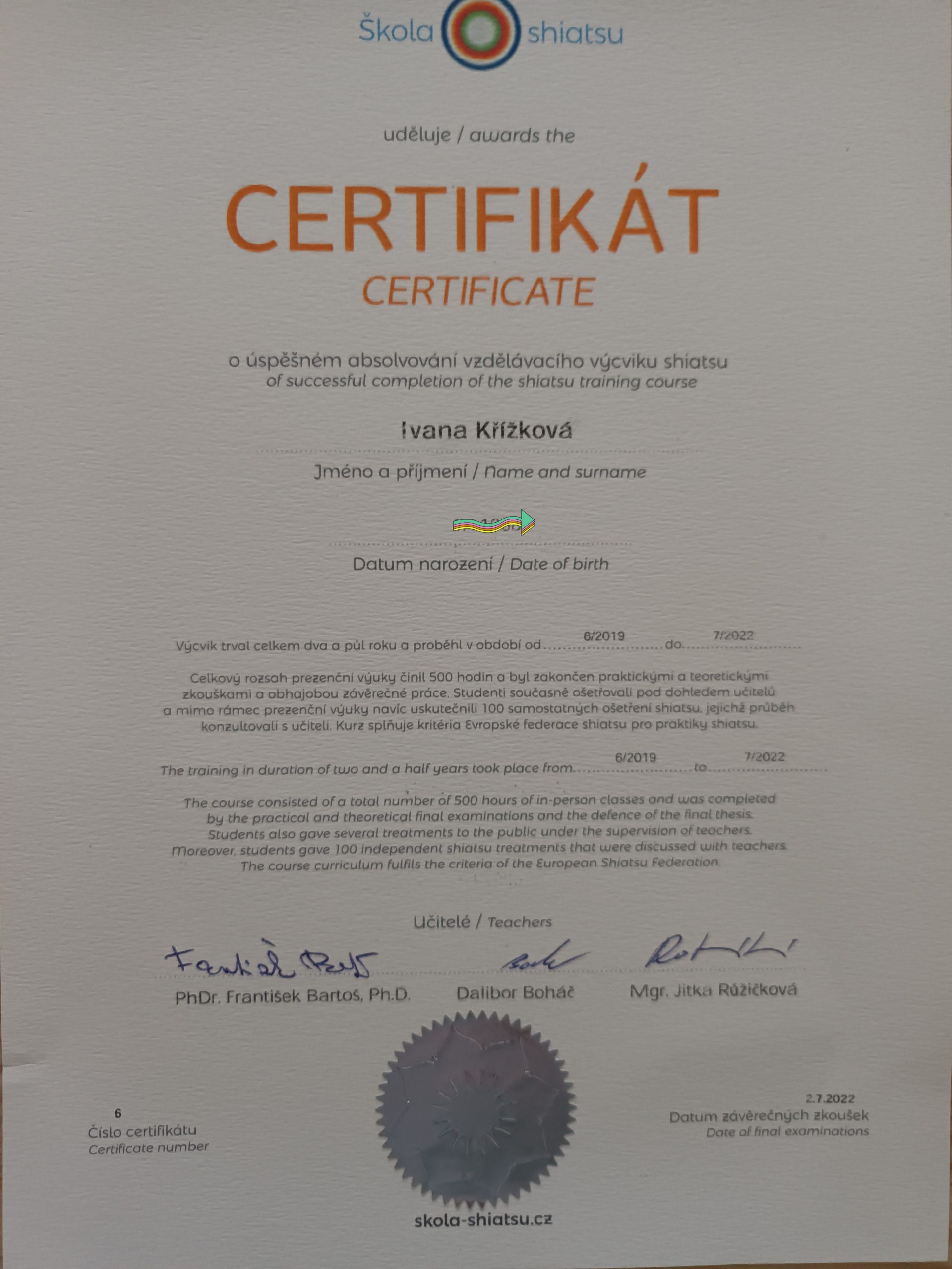 Absolvovala jsem tříleté studium na škole shiatsu. Kurz, který splňuje kritéria Evropské federace shiatsu pro praktiky shiatsu, jsem v červenci 2022 úspěšně dokončila.